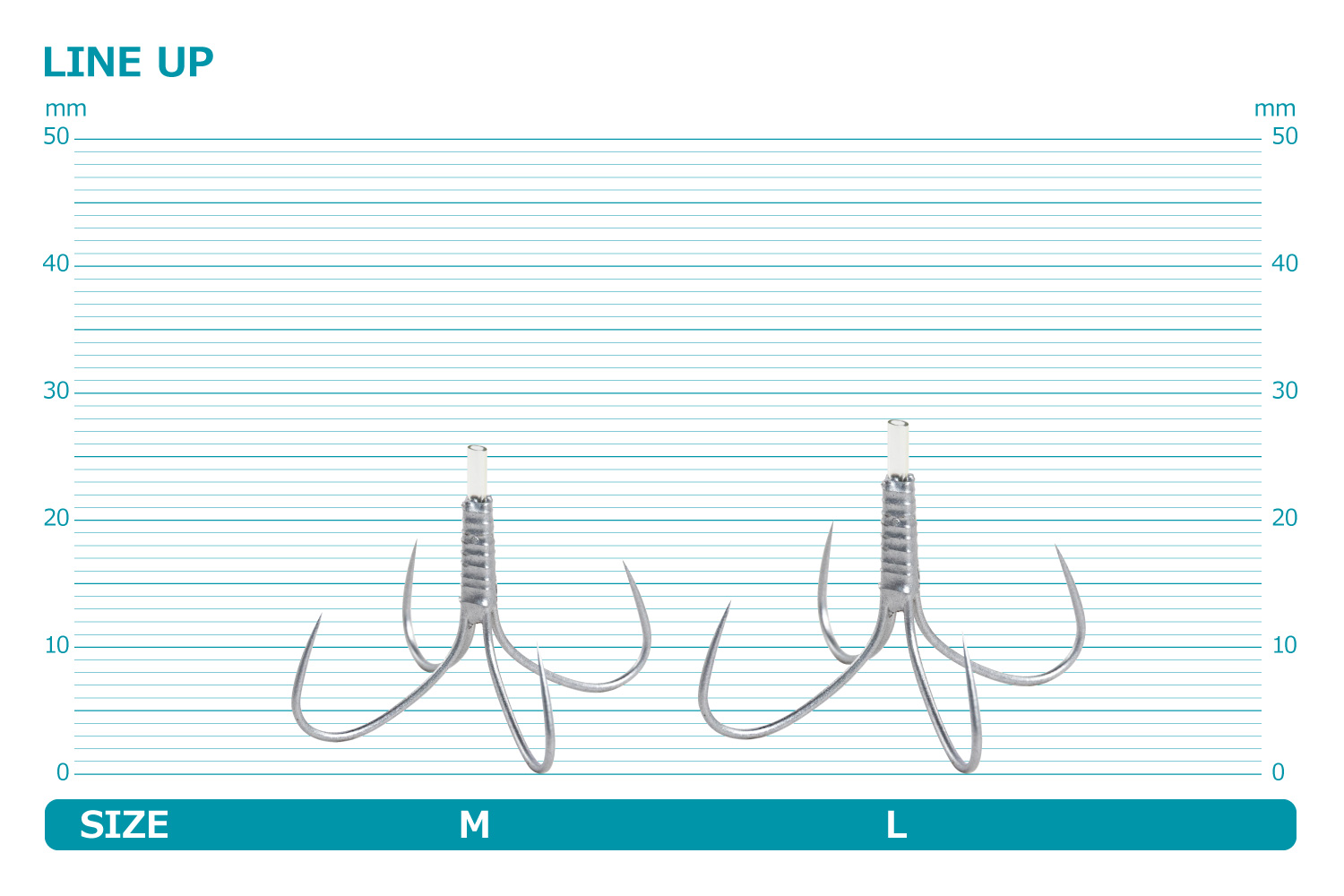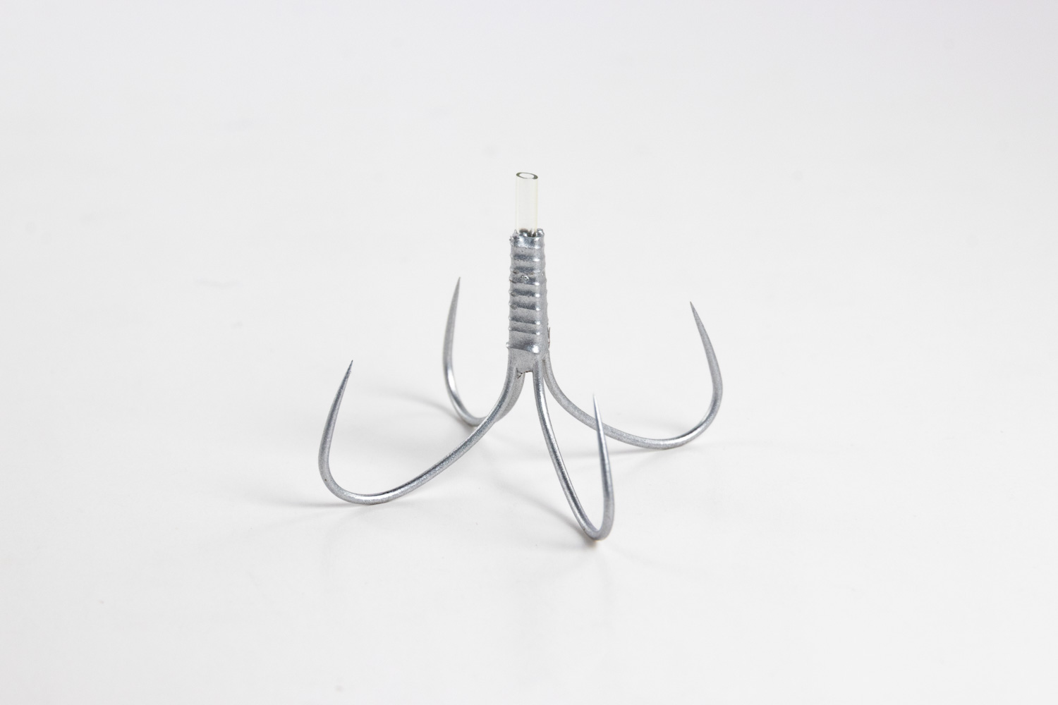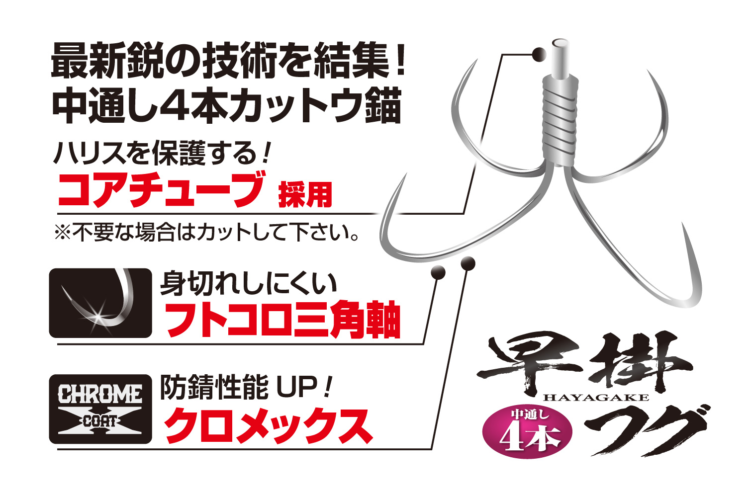 超先鋭で掛かり重視、かつフトコロに三角軸加工を施すことでキープ力を持たせた最新型のカットウイカリです。ハリス中通し式で首ふり・ぐらつきを抑える為、掛かり率もUP。仕掛作成の際は結びコブを作り、抜け止めやはねあげ防止にビーズ、ウキ止めゴムなどをご使用ください。広く掛けられる4本錨タイプ。